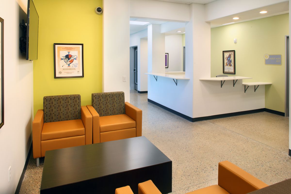 The site brought a unique challenge with a 40 foot easement running down the middle of it. This easement space was leveraged to provide a private courtyard. It also created a condition of splitting the building space into two separate buildings. This separation became a benefit in isolating the administrative, guest and patient intake from the residential and treatment spaces.