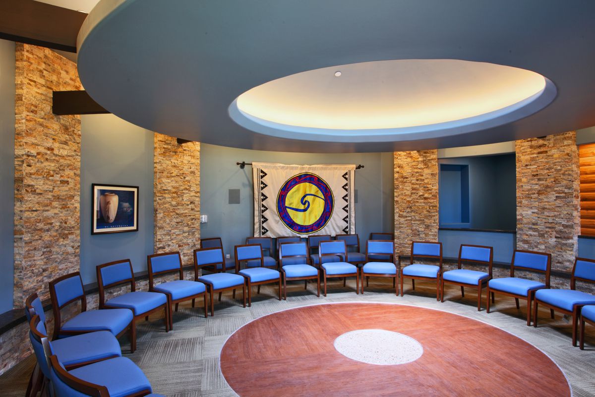 The focal point of the facility is the main group room known as the “Talking Circle”. This room leverages Native American healing and holistic wellness using the mind, body, and spirit. Integrating a circle in the design, allows residents to be open in a comfortable non-threating environment making everyone equal. It also leverages the Native American use of the four cardinal directions (North, East West & South) in the design to reinforce the journey to health and wellness. This will then provide a path for a long lasting treatment and recovery.