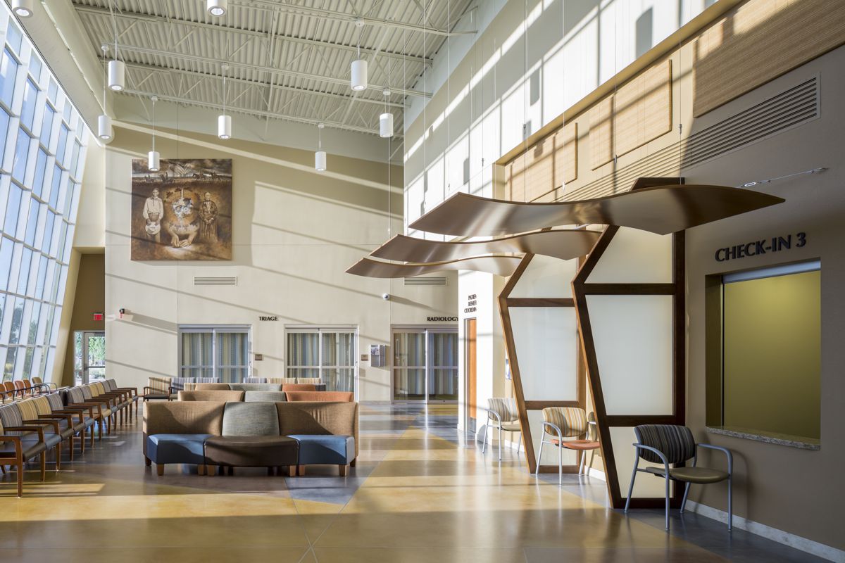 - Cultural Influences: The culture and traditions of the Navajo community were honored by orienting the entry toward the east, providing clockwise circulation within the building, and integrating the landscape into the public spaces while providing areas for local Native American art.