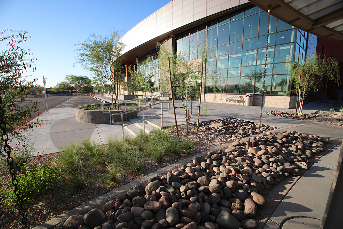 The Landscape at the main building approach is designed with the symbology of a River Walk leading from the new parking to the east entrance. An enclosed outdoor area with an amphitheater is designed to encourage group meetings and connectivity to nature which is a big component in Traditional Healing.