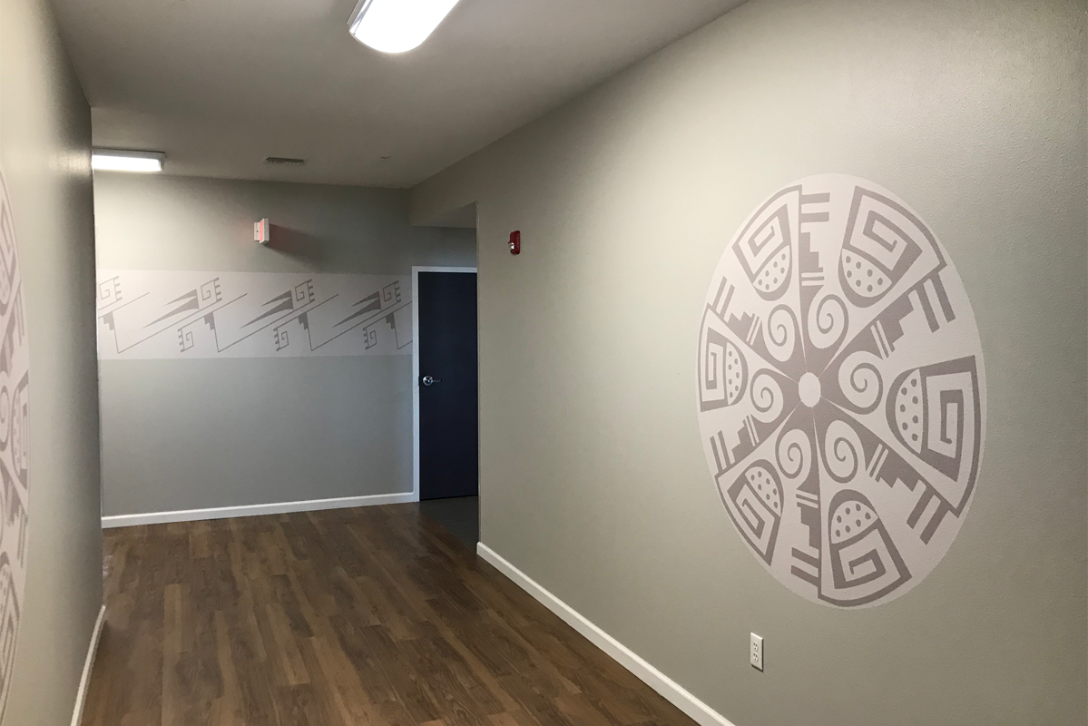 The location of the apartment is tucked at the base of one of the Mesas in Keams Canyon - lending itself to a striking backdrop and appreciation of the region when you first drive up. At each entrance a local artist was commissioned to create a mural that reflected the culture of the 21st century. This theme continued into the main corridor, connecting the outdoors and the indoors.