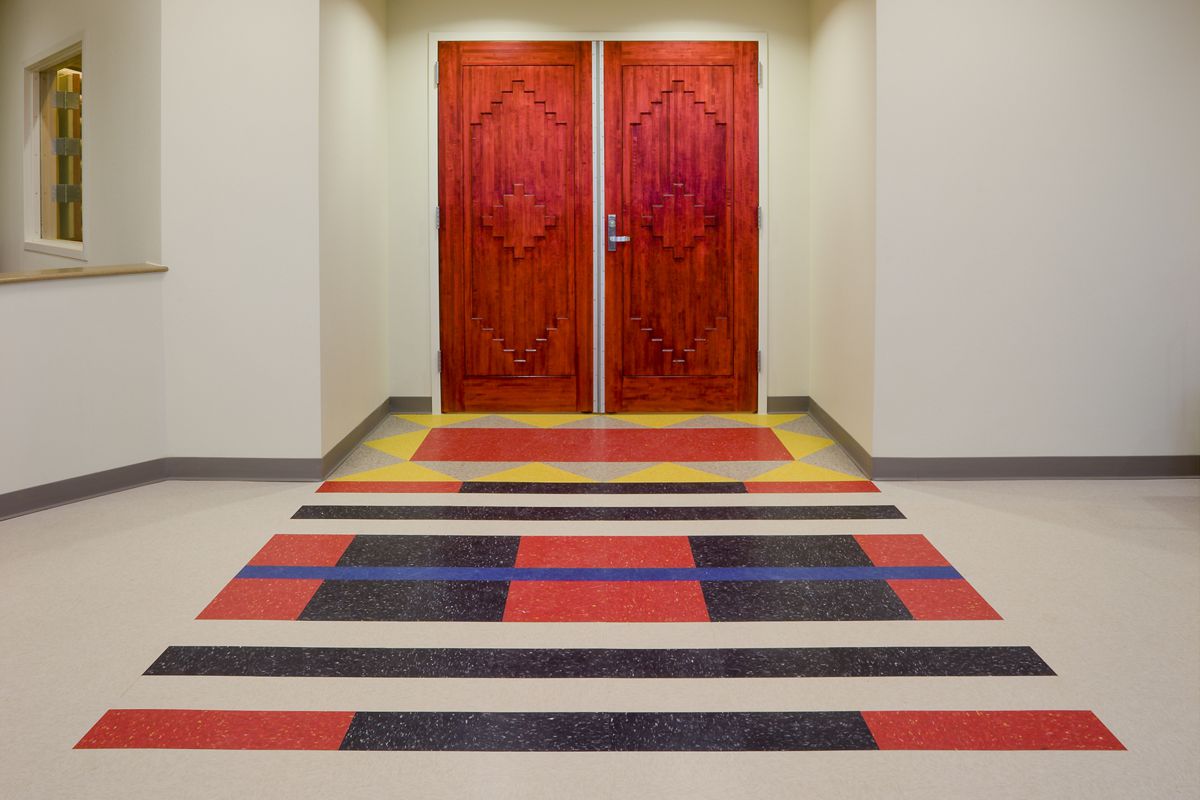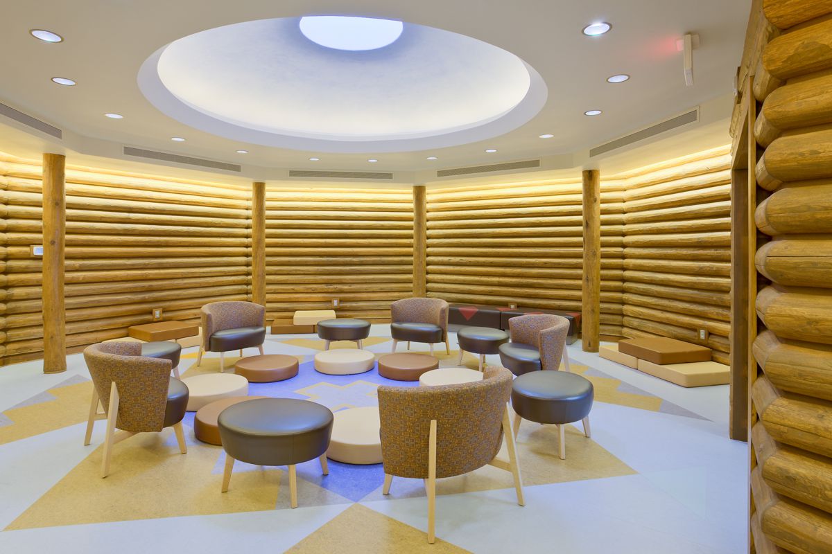 The Dilkon District Court Facility incorporates modern interpretation of traditional cultural values by providing Hogan shaped court and Peacemaking rooms, an East facing entrance, geometric designs in the walls ceilings and floors, and domed ceilings and skylights in the court and Peacemaking rooms.